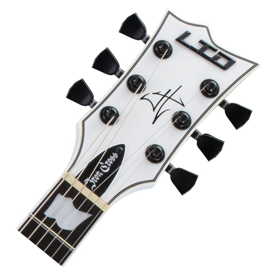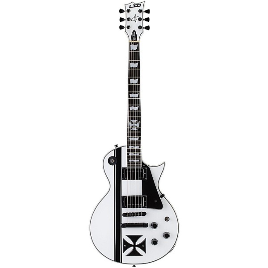 The LTD Iron Cross is a Signature Series model of James Hetfield, the frontman of Metallica and one of the world's most highly respected rhythm guitar players in any genre. The Iron Cross is based on James' personal custom instrument design, and features set-neck construction of a mahogany body with maple cap, and a three-piece mahogany neck with ebony fingerboard and 22 extra-jumbo frets with an Iron Cross inlay at the 12th fret. The LTD Iron Cross is powered by James' own EMG JH SET active pickups, and includes a TonePros locking TOM bridge and tailpiece. Available in Snow White finish with black stripe graphic and iron cross fixture.Product Features: