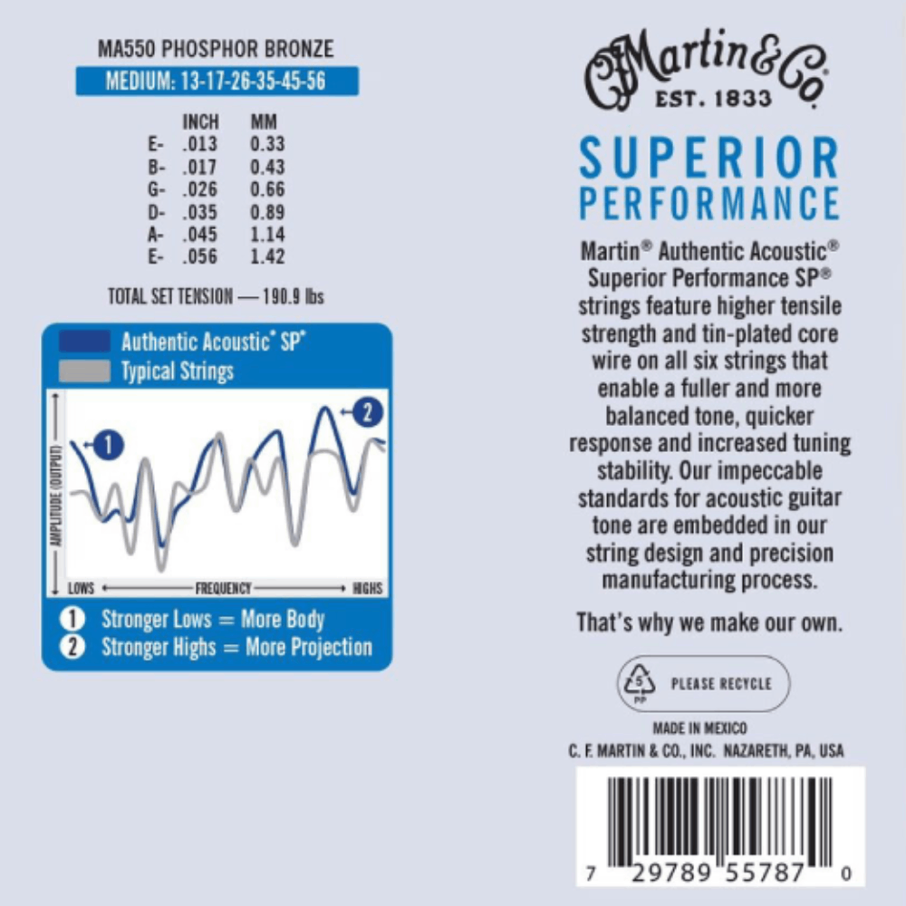 Martin® Authentic Acoustic® Superior Performance SP® strings feature higher tensile strength and tin-plated core wire on all six strings that enable a fuller and more balanced tone, quicker response and increased tuning stability. Our impeccable standards for acoustic guitar tone are embedded in our string design and precision manufacturing process. That's why we make our own.Product Features: