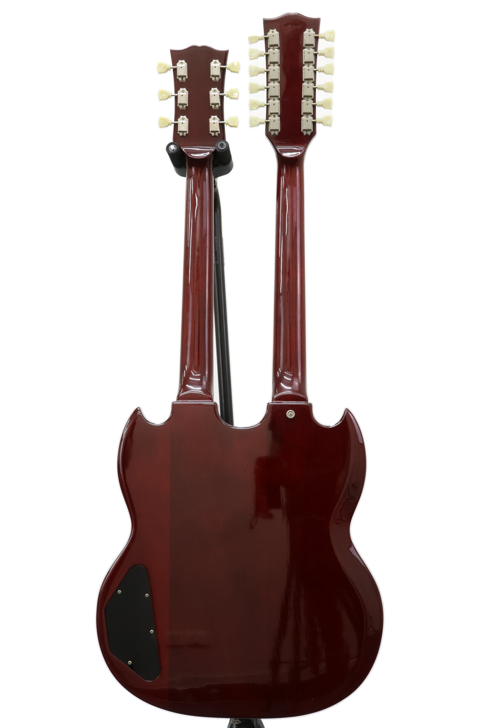 Second Hand Fernandes FSG-120W Double Neck. Mahogany body and two set necks deliver warm, chimey 12-string tones up top and 6-string below. Four vintage humbuckers, bound rosewood fretboards with parallelogram inlays, chunky C-shaped profiles, and original Kluson-style tuners. Gloss cherry finish shows light play wear—excellent player with cool Led Zep inspired hardcase.