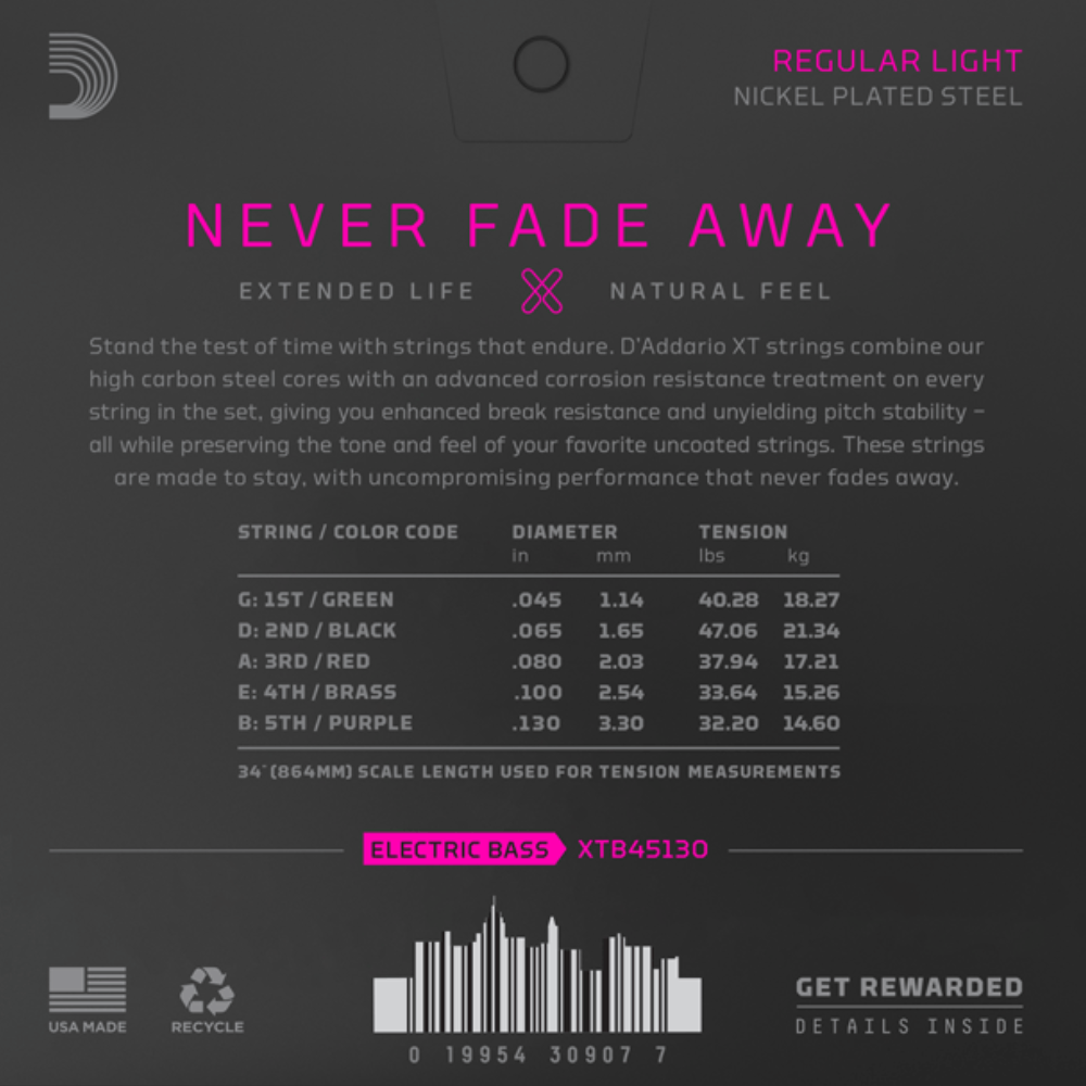 D'Addario XTB45130 XT Nickel Plated Steel Regular Light Long Scale Bass Guitar Strings 45-130 Gauge