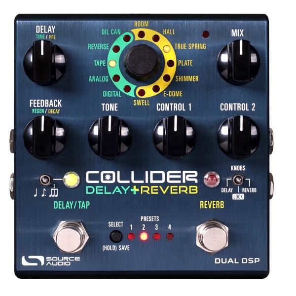 The Collider Stereo Delay + Reverb from Source Audio will unleash unique tones that are perfect for the guitarist thats always experimenting. This pedal has seven reverb types and five delay engines crammed into one housing with intuitive controls. Its loaded with dual 56-bit DSP processors that give you enough experimental potential to run both effects simultaneously.
