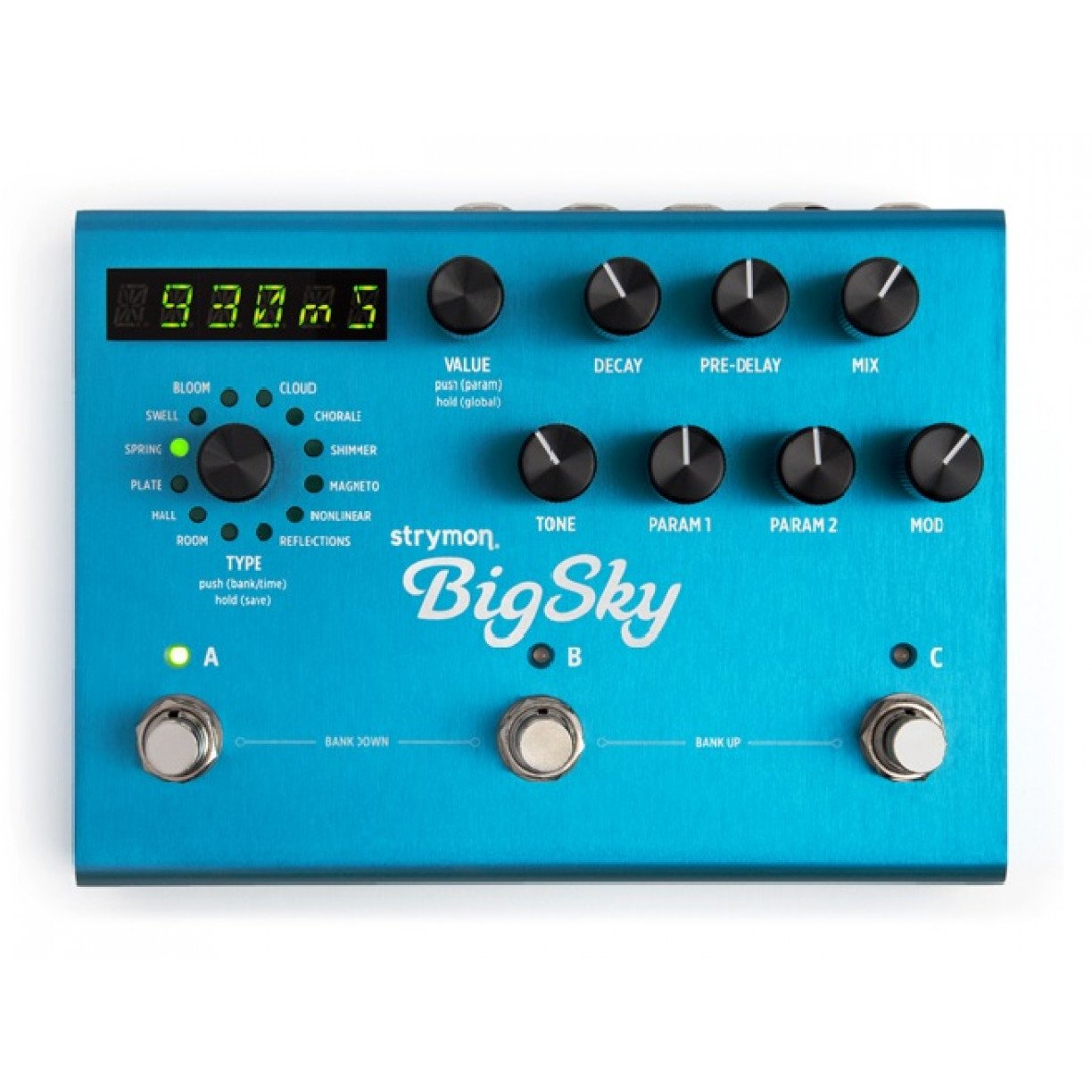 The Strymon BigSky Multidimensional Reverb multi-effects pedal offers a wide assortment of reverb effects currently on the market. Twelve different types of reverb are available with a twist of a knob, and you can deeply edit the effects and store them in the 300 onboard preset slots. And an incredibly powerful SHARC DSP powers the pedal for the best sound quality possible.