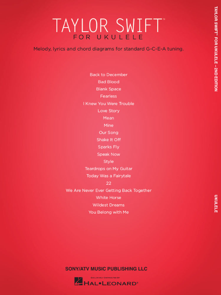 Custom uke arrangements with lyrics of 20 of Swift's best so far, including: Back to December • Fearless • Fifteen • Love Story • Mean • Mine • Speak Now • The Story of Us • Teardrops on My Guitar • Today Was a Fairytale • White Horse • You Belong with Me • and more.