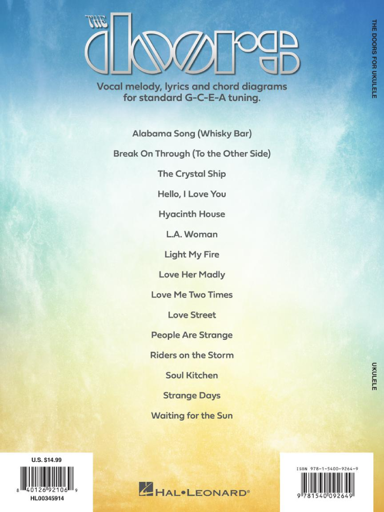Now you can strum along to 15 Doors classics on the ukulele! This songbook with arrangements in standard G-C-E-A uke tuning includes: Break on Through (To the Other Side) • Hello, I Love You • L.A. Woman • Light My Fire • Love Her Madly • People Are Strange • Riders on the Storm • Waiting for the Sun • and more.