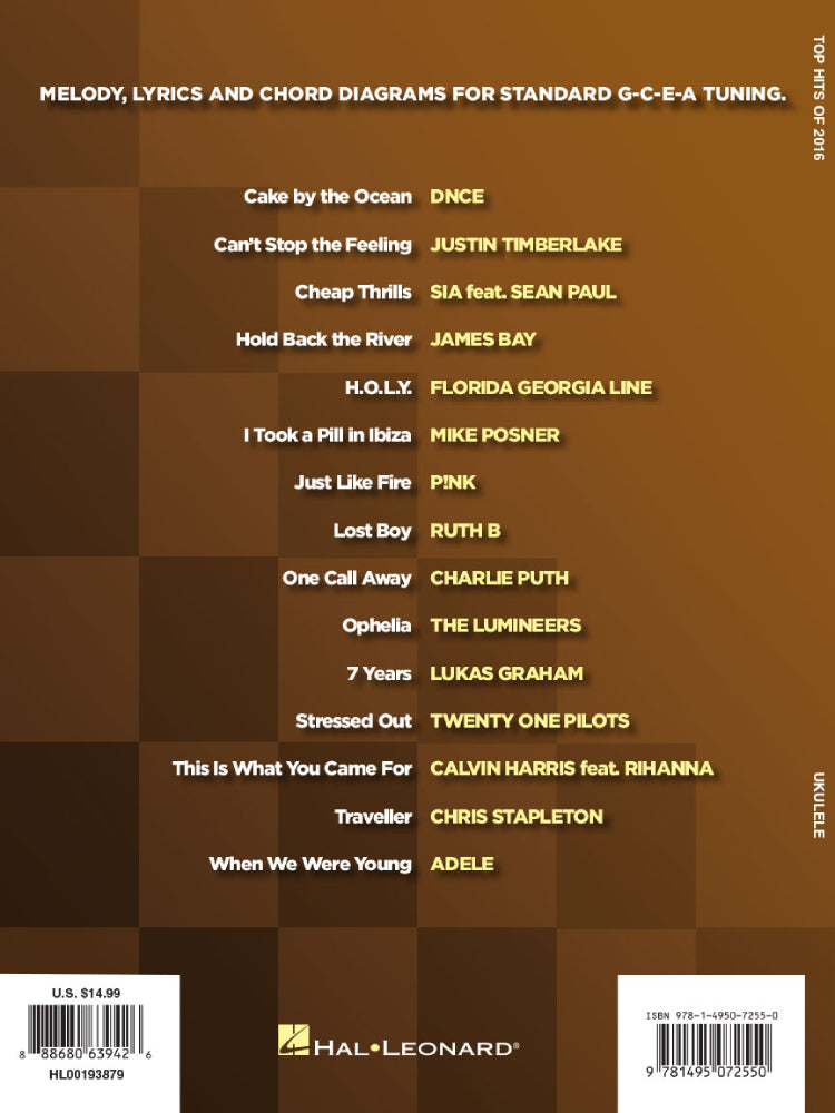 15 of the most popular songs of the air arranged for the uke, including: Cake by the Ocean • Can't Stop the Feeling • Cheap Thrills • H.O.L.Y. • I Took a Pill in Ibiza • Just like Fire • Lost Boy • One Call Away • 7 Years • Stressed Out • When We Were Young • and more.