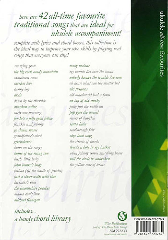 Here are 42 all-time favourite traditional songs that are ideal for Ukulele accompaniment! Complete lyrics and chord boxes, this collection is the ideal way to improve your Uke skills by playing real songs that everyone can sing. For Ukuleles in standard GCEA tuning.