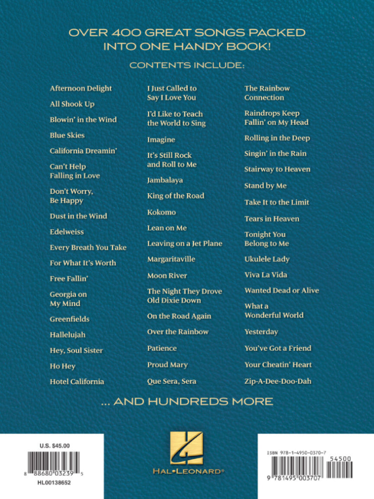 This collection is nearly bigger than your uke! Over 400 songs packed into one convenient songbook that lets you play all the songs you've ever wanted to, including: All Shook Up • Blowin' in the Wind • California Dreamin' • Don't Worry, Be Happy • Edelweiss • Free Fallin' • Georgia on My Mind • Hallelujah • Hey, Soul Sister • Hotel California • Imagine • Jambalaya • Kokomo • Lean on Me • Margaritaville • Over the Rainbow • Proud Mary • Que Sera, Sera • Rolling in the Deep • Singin' in the Rain • Stand by Me • Tears in Heaven • Ukulele Lady • Viva La Vida • What a Wonderful World • Your Cheatin' Heart • Zip-a-Dee-Doo-Dah • and hundreds more! Includes chord grids for soprano, concert and tenor ukuleles. 9″ x 12″ comb bound.