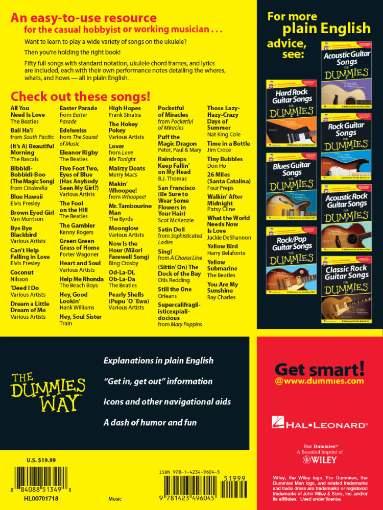 Want to learn to play a wide variety of songs on the ukulele? Then this is the right book for you! An easy-to-use resource for the casual hobbyist or working musician, this collection features 50 full songs with standard notation, ukulele tablature, lyrics, and helpful performance notes.Tunes include: All You Need Is Love · Can't Help Falling in Love · Edel weiss · The Gambler · Hey, Soul Sister · Mr. Tambourine Man · Puff the Magic Dragon · (Sittin' on) The Dock of the Bay · Still the One · Tiny Bubbles · You Are My Sunshine · and more.