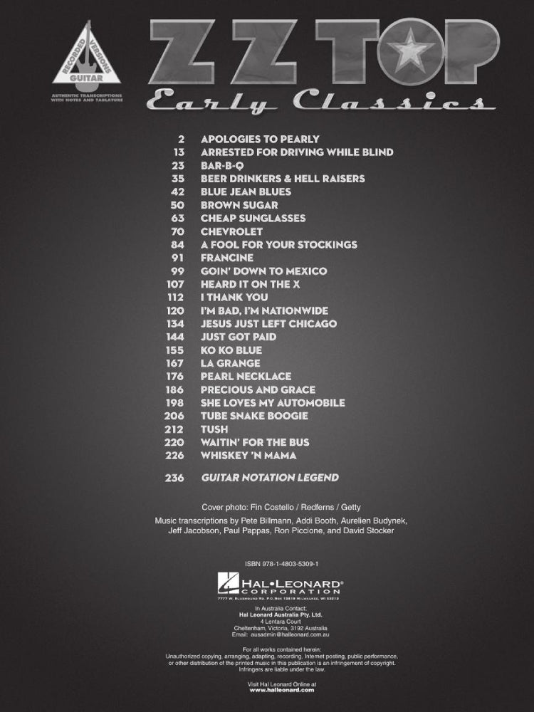 Transcriptions of Billy Gibbons' work on 16 hits from the Texan blues-rock trio: Beer Drinkers & Hell Raisers • Blue Jean Blues • Brown Sugar • Cheap Sunglasses • Francine • I'm Bad, I'm Nationwide • Just Got Paid • La Grange • Pearl Necklace • Tube Snake Boogie • Tush • and more.